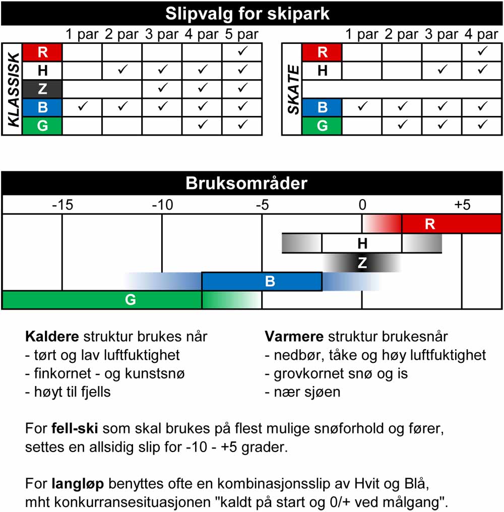Best glid er det i snøen mellom minus to og minus ti grader. Da er vannfilmen mellom såle og snø ideell. Her velger man en medium struktur. Andre faktorer som spiller inn på valg av struktur er hvor gammel snøen er, hvor kornet den er, samt faktorer som luftfuktighet og forurensning.